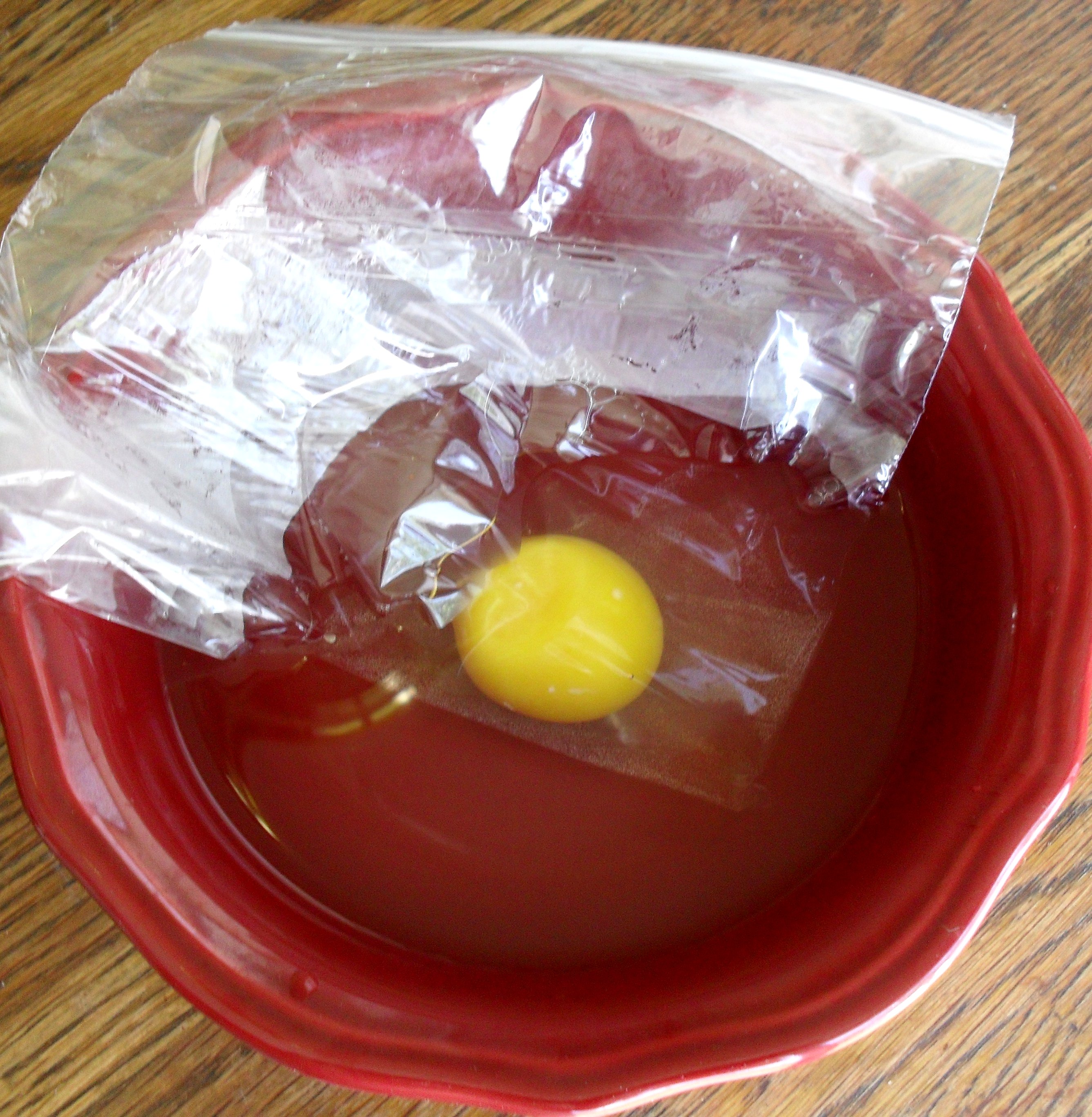 As you may or may not know, eggs should be at room temperature when using them in bread & scratch cake recipes–the former to keep from inhibiting the yeast action (cold=bad in bread language), and the latter for better structure in the cake.  You can quickly bring eggs to room temperature with the exact same method as I use for defrosting meat.  Crack your eggs into a sandwich bag (putting all of them in one bag is OK), seal it, and plop it into a bowl of hot tap water.  It will only take about 5 minutes or less, depending on how many eggs are in your bag.  You can also put the uncracked eggs in a bowl of hot tap water, but it will take much longer to bring them to room temperature and there’s no way to tell for sure if they’re warm until you crack them.  In the bag,  you can feel them through the plastic.