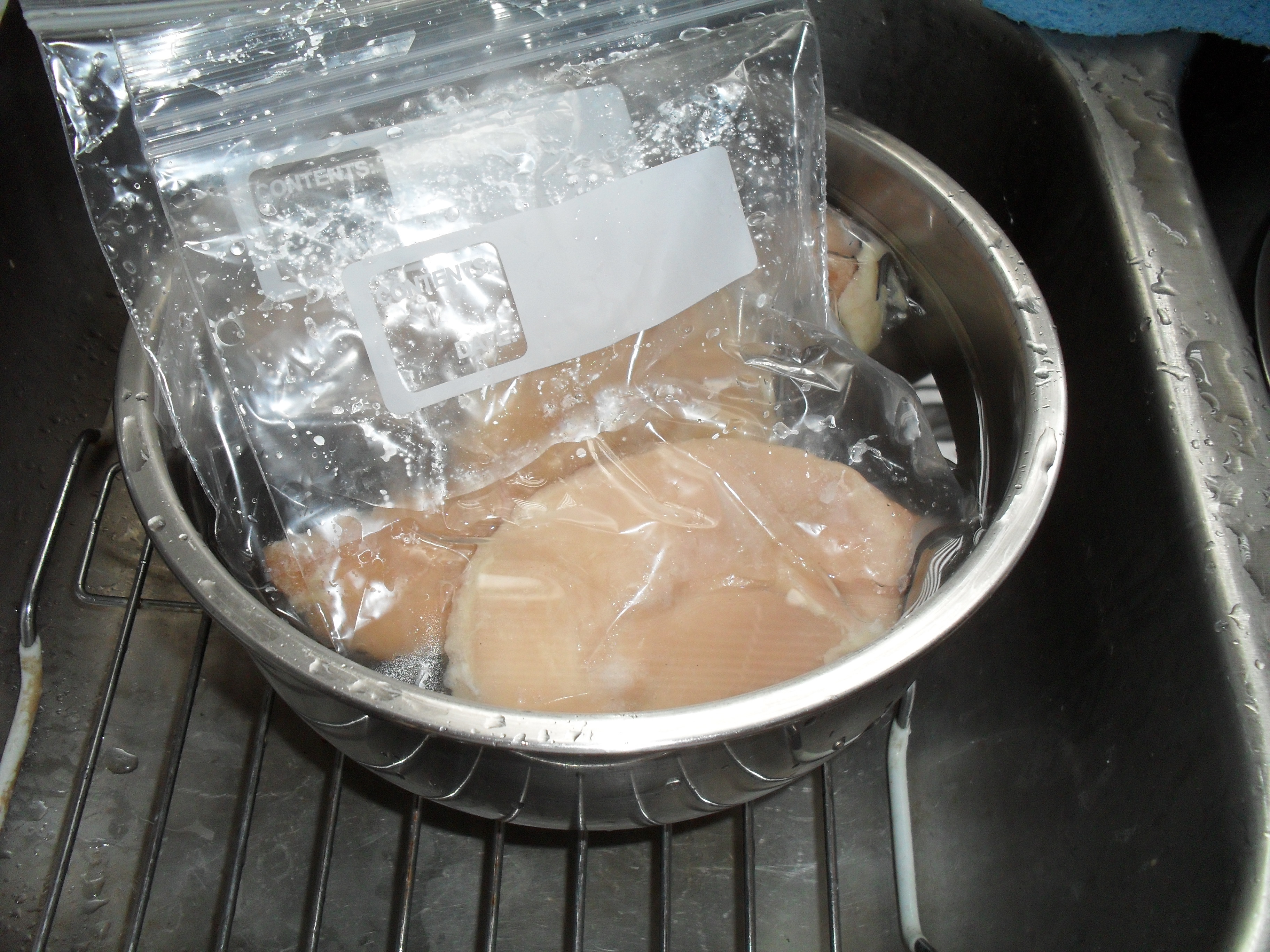 OK, so to quickly defrost meat, simply fill a bowl with extremely hot tap water, seal the meat in a Ziploc bag and plop it in.  Change the water when it becomes tepid and feel the meat to check temperature.  It usually takes 10 minutes-1/2 hour, depending on the amount and the thickness.  For chicken breasts, I put each one in an individual bag rather than a large Ziploc bag because they will stick together and that slows the defrosting.  I do the same with fish fillets.  I haven’t yet tried this with hamburger or sausage but I don’t see why it wouldn’t work.