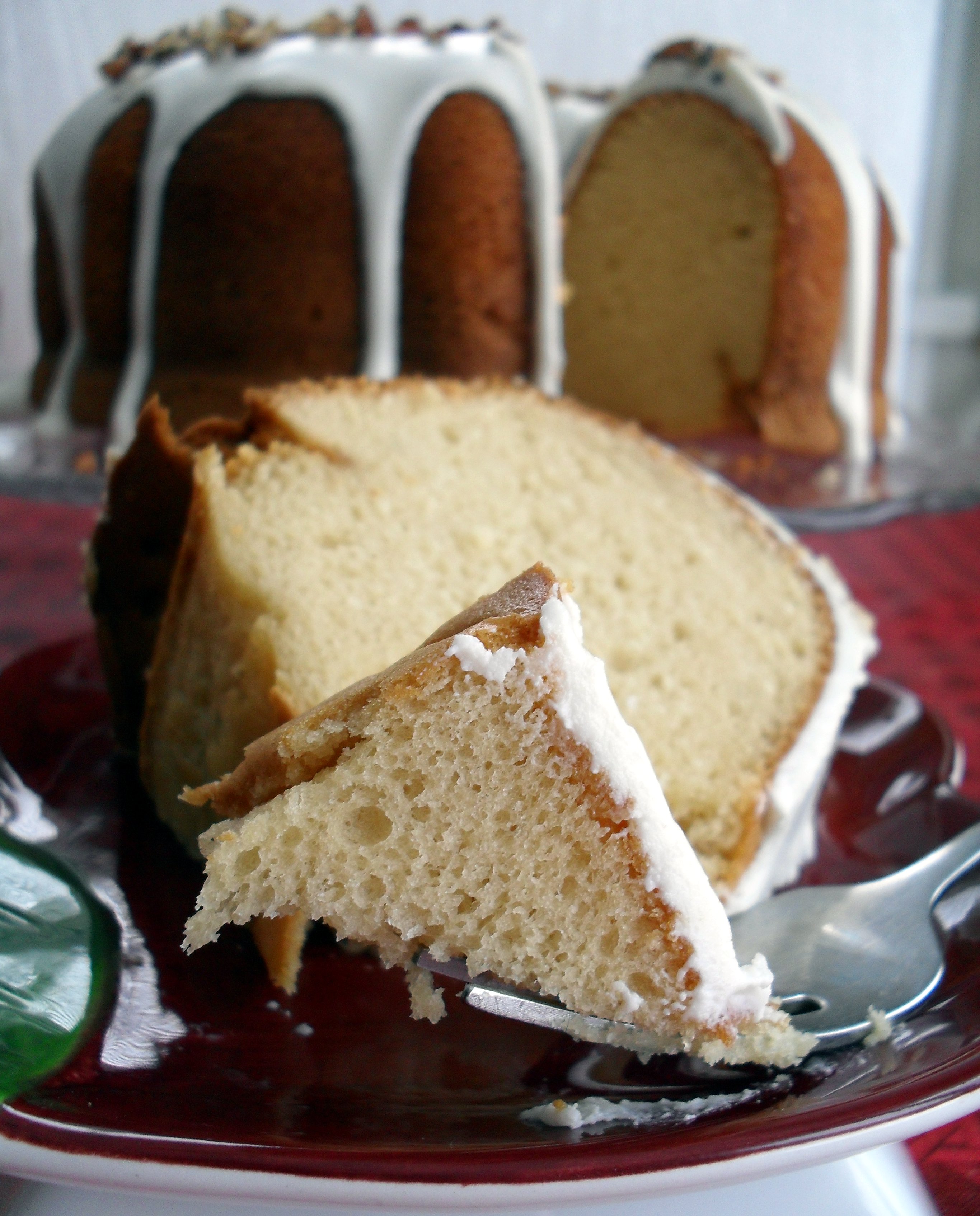 For two months, I glanced guiltily over at that mix each time I opened my cupboard where I keep most of my baking supplies.  I finally, finally took the cake mix down and found a recipe on the back for butter pecan-rum cake…and that’s all she wrote.  I made it immediately and after Dennis and I ate 1/3 of the cake ourselves, I brought the remainder to work where it was promptly devoured.