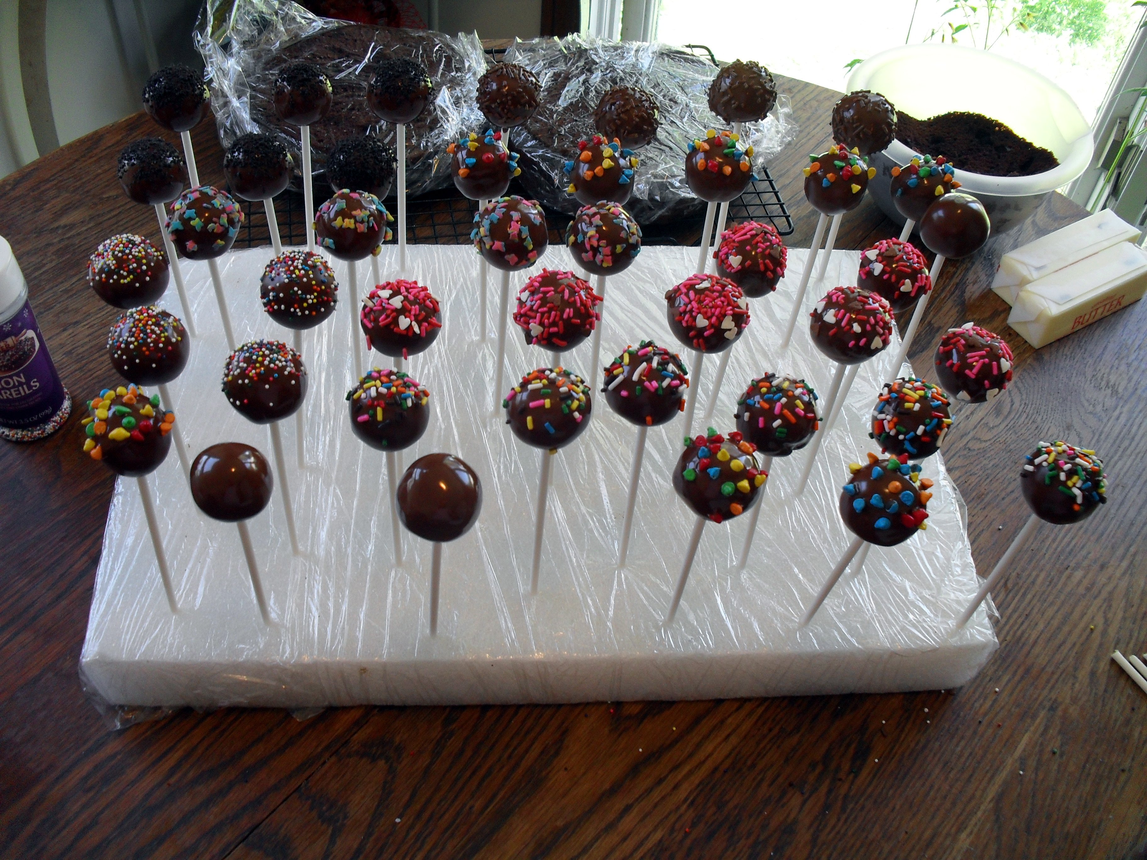I was multitasking on Saturday. Behind the cake pops are two round cakes, wrapped until I had the time to frost them, two sticks of butter waiting to be turned into frosting, and cake tops in a small bowl, waiting to be turned into more cake pops once the icing was made.