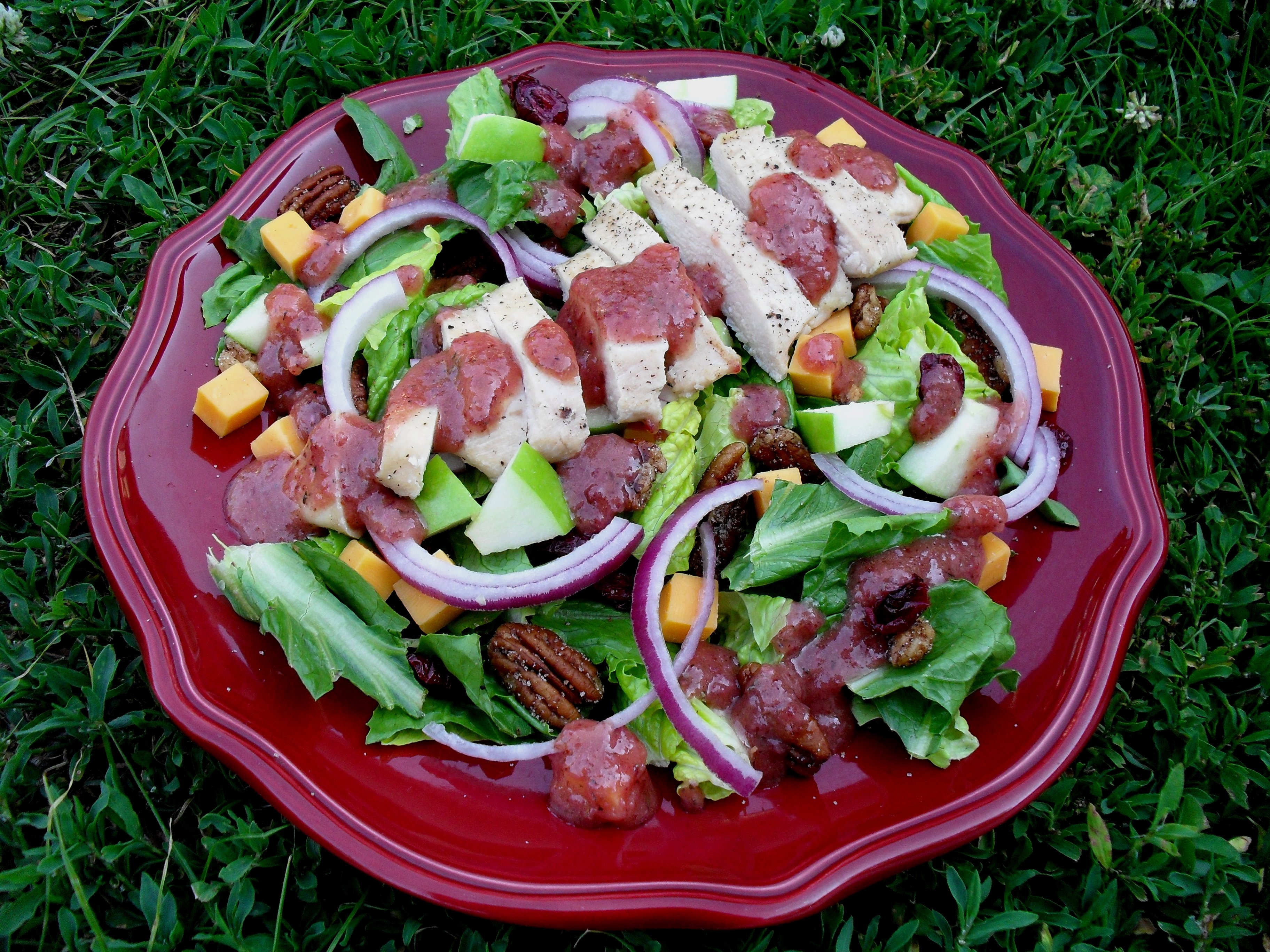 Romaine Salad with Chicken, Cheddar, Apples, Spiced Pecans and Cranberry Vinaigrette