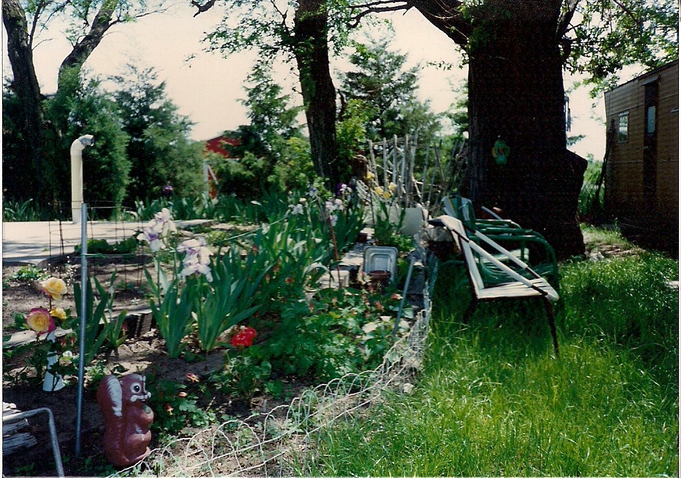 Grandm’as yard. Can you find the wind catcher she made out of a 7-up bottle?
