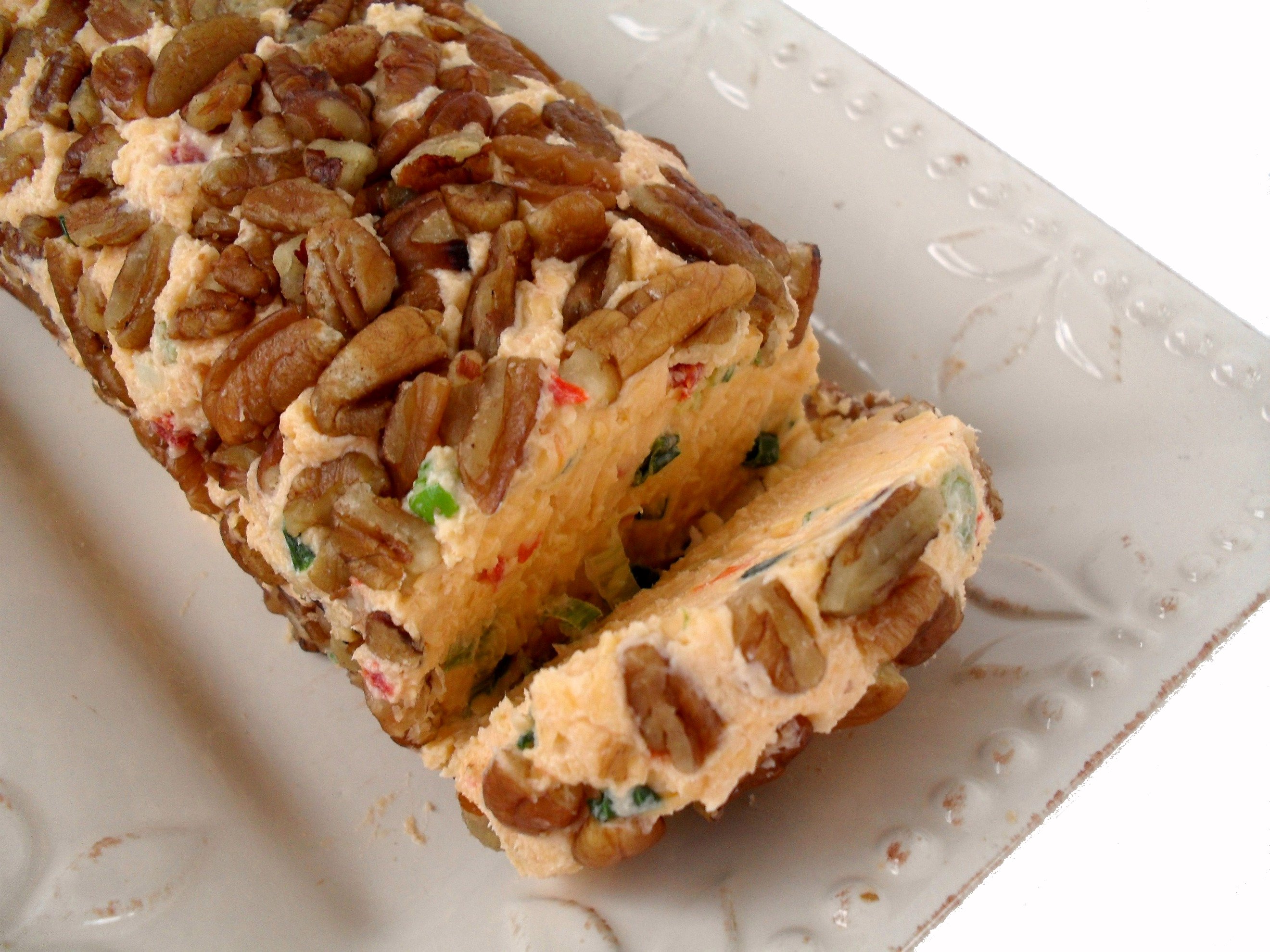 Place everything but pecans in a mixing bowl and beat until well blended and the cheese & pimientos have been broken down a bit. The mixture will be very soft. Scoop out onto a long sheet of plastic wrap and roll into a log, tying the ends with twist ties. Refrigerate overnight. Put nuts in an even layer on a baking sheet and roll log in them. Press nuts into any spots that didn’t get any nuts and carefully lift log onto serving plate. Cover with plastic wrap and refrigerate until ready to serve. Serve chilled with a variety of crackers.