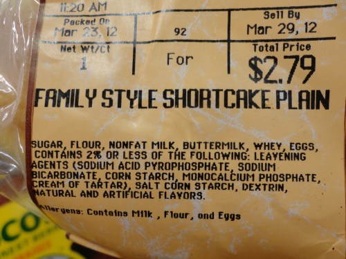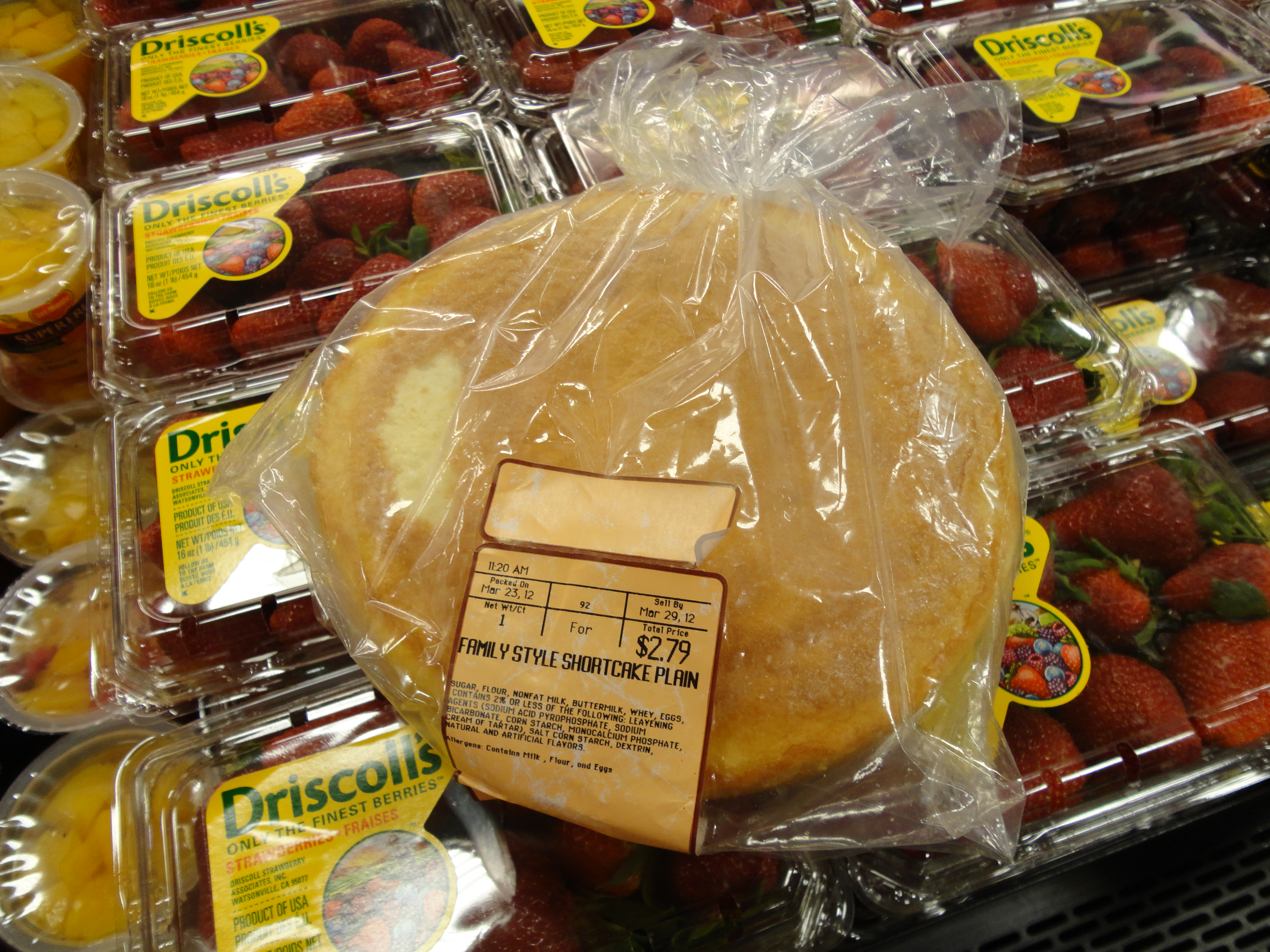 Growing up, Mom would make a very particular kind of strawberry shortcake at least once every summer. She would buy a “Family Style Shortcake” from Dillons, like this: