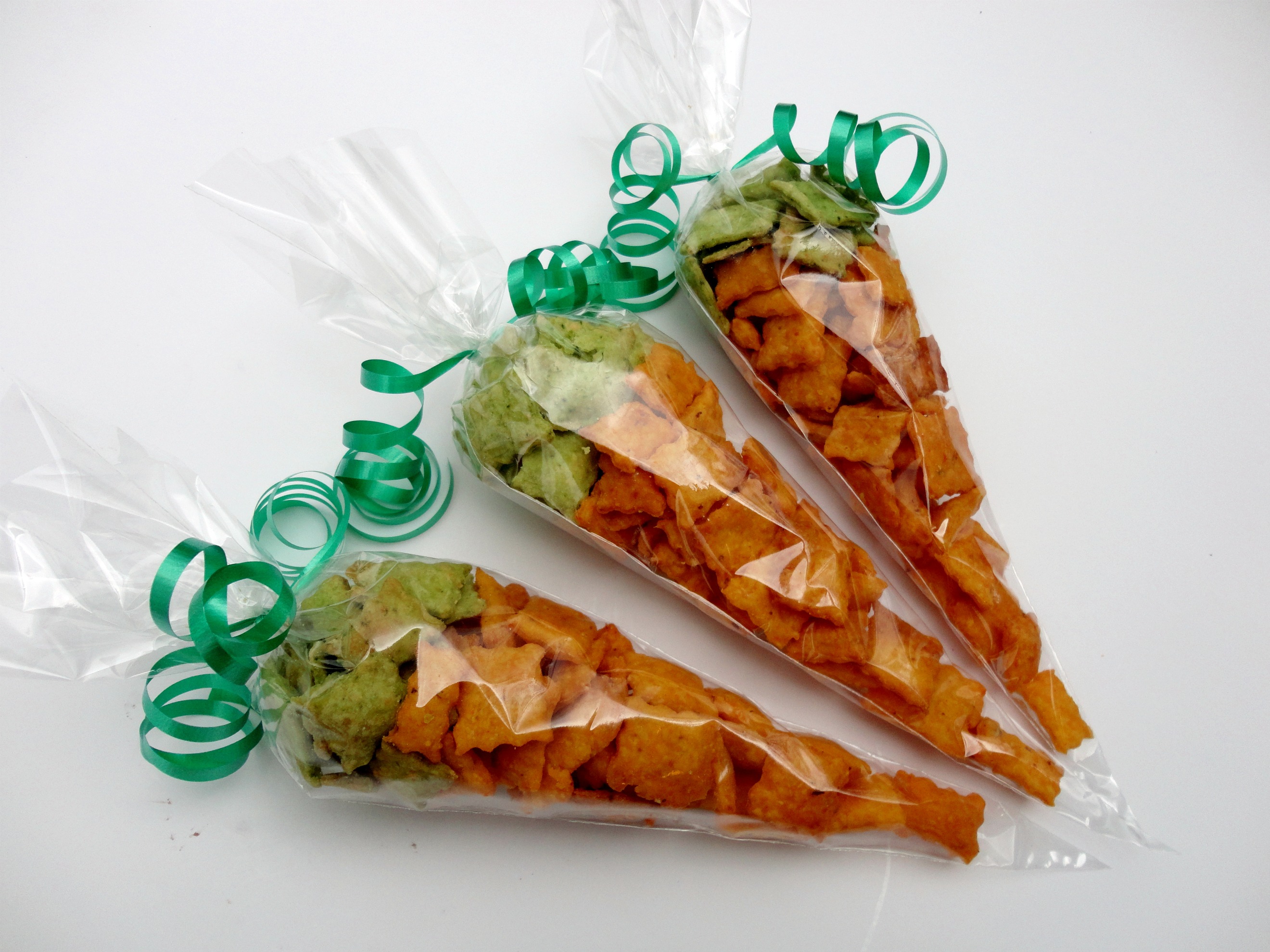 To make the “carrots,” Fill cone-shaped cellophane bags half full with cheddar-carrot crackers, then top with an inch of Parmesan-spinach crackers. Tie bags with green curling ribbon and curl with scissors.