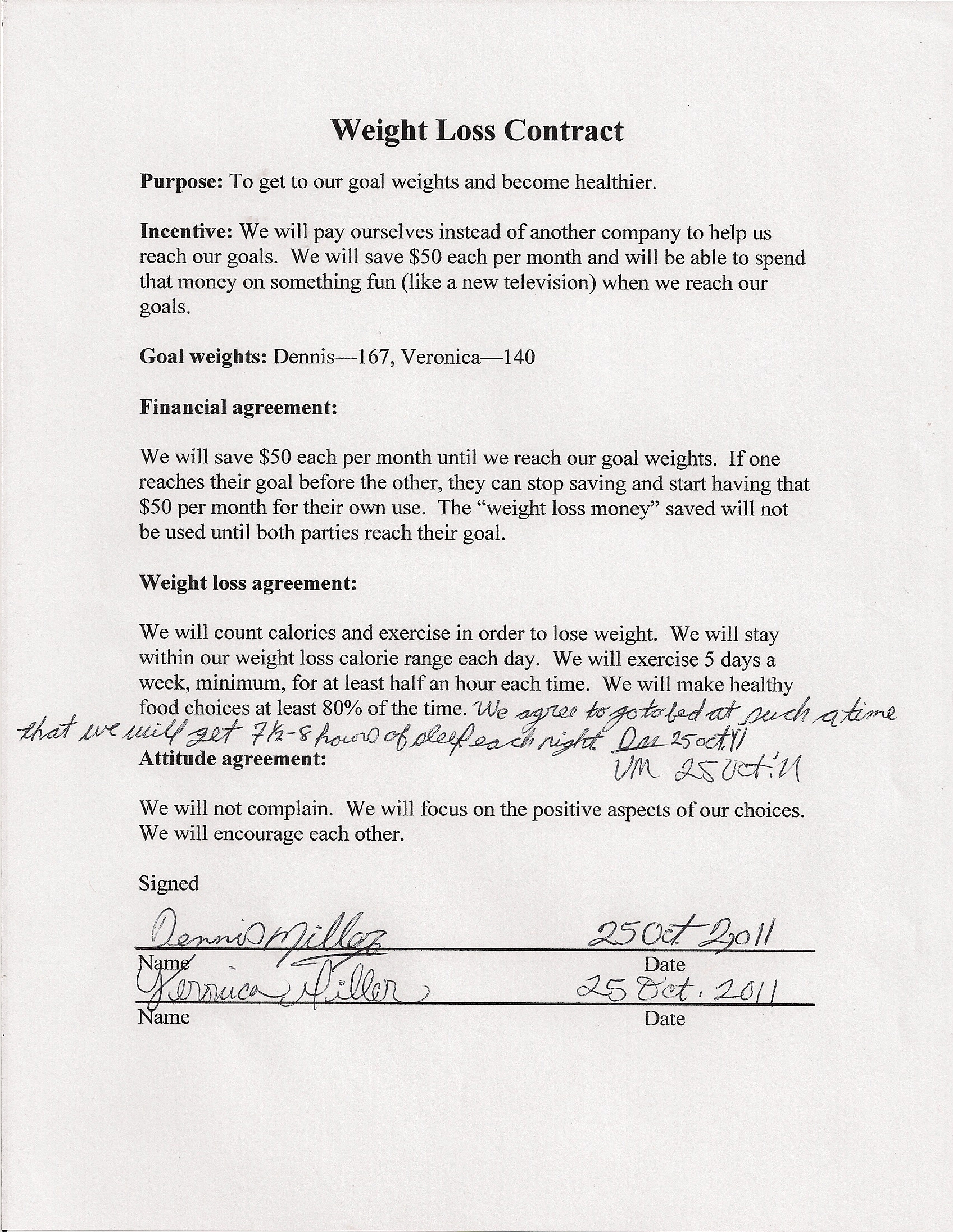 We each agreed to count our calories, exercise five times a week, and get 7 1/2-8 hours of sleep each night.