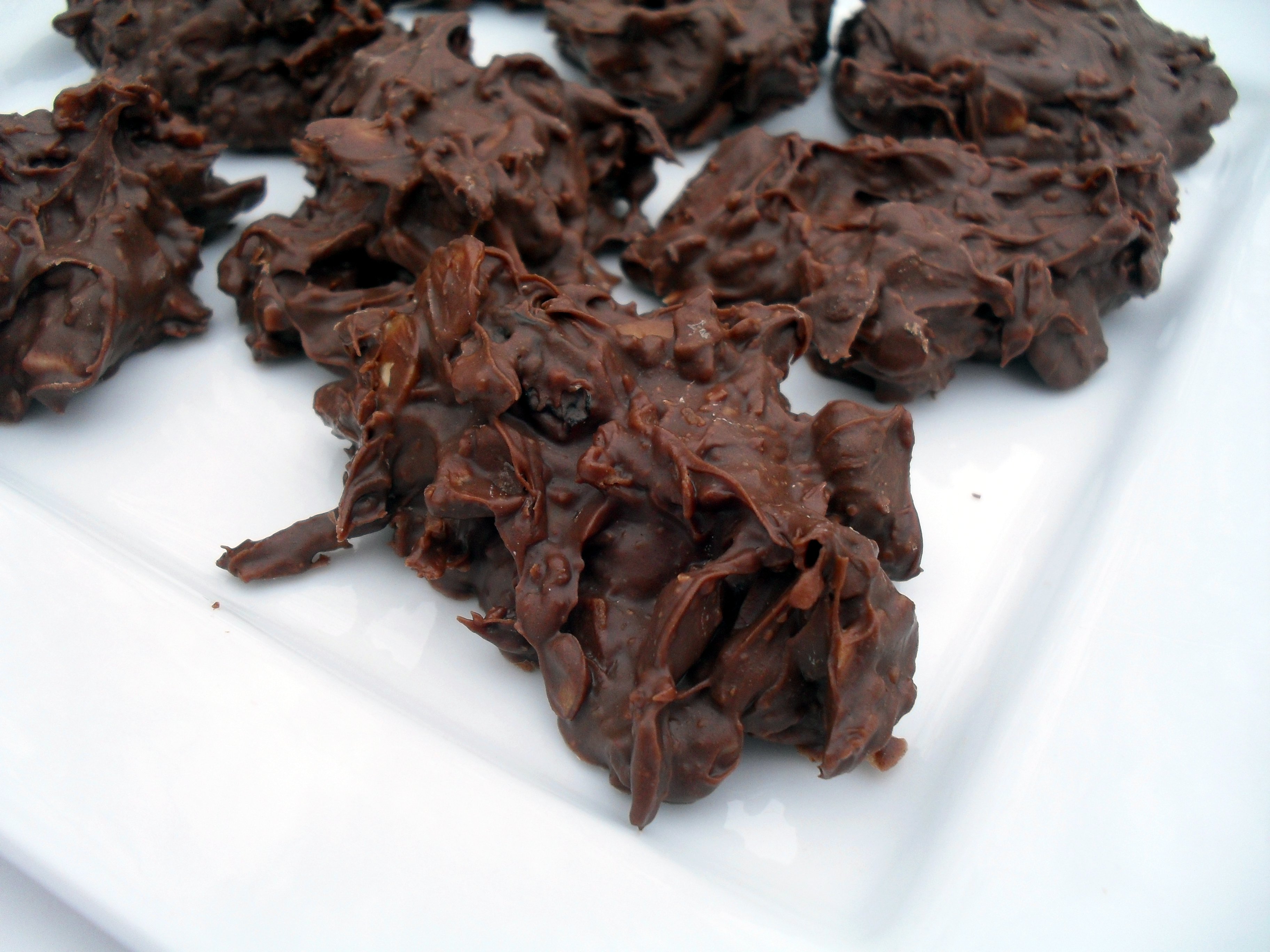 I’m not sure where this recipe originated but you can find it all over the web.  Mine is a little different from the others, which only call for almonds and raisins with the chocolate.  Because cow pies have grass in them (OK, maybe I’m getting a little too graphic here!), I like to add coconut to mimic that.