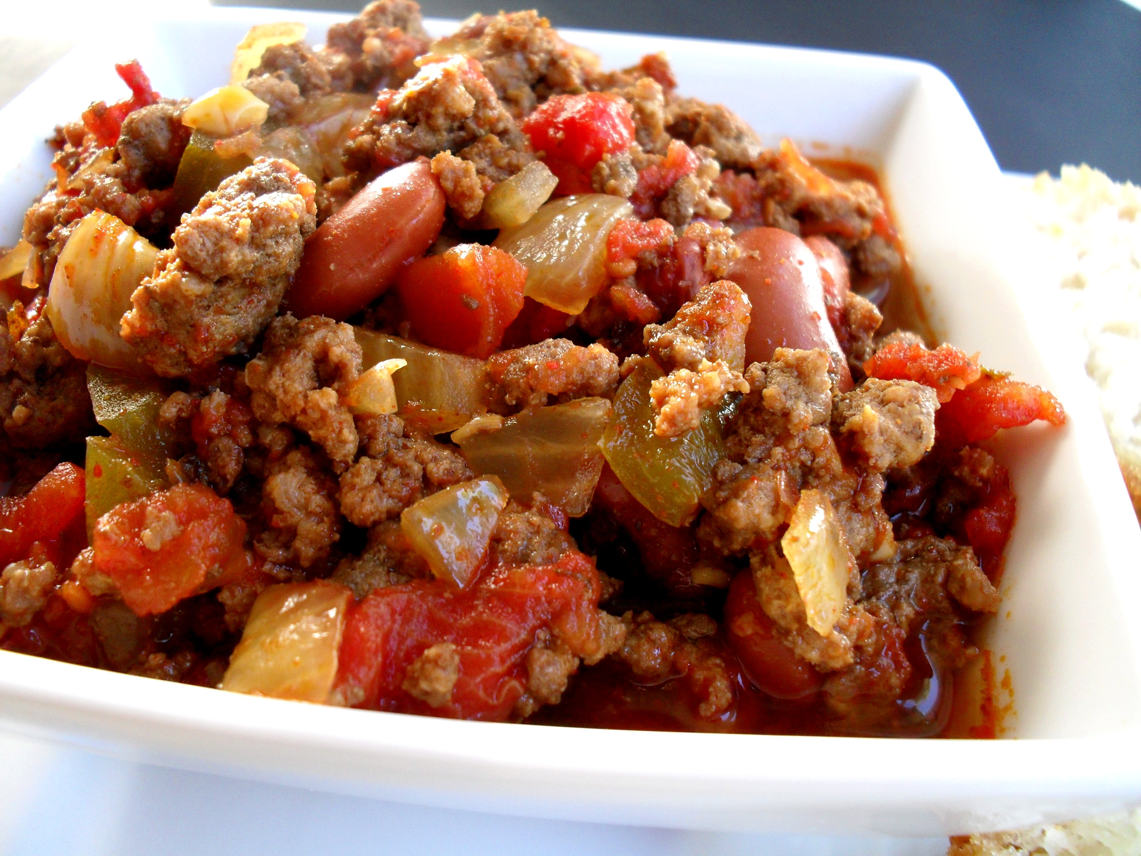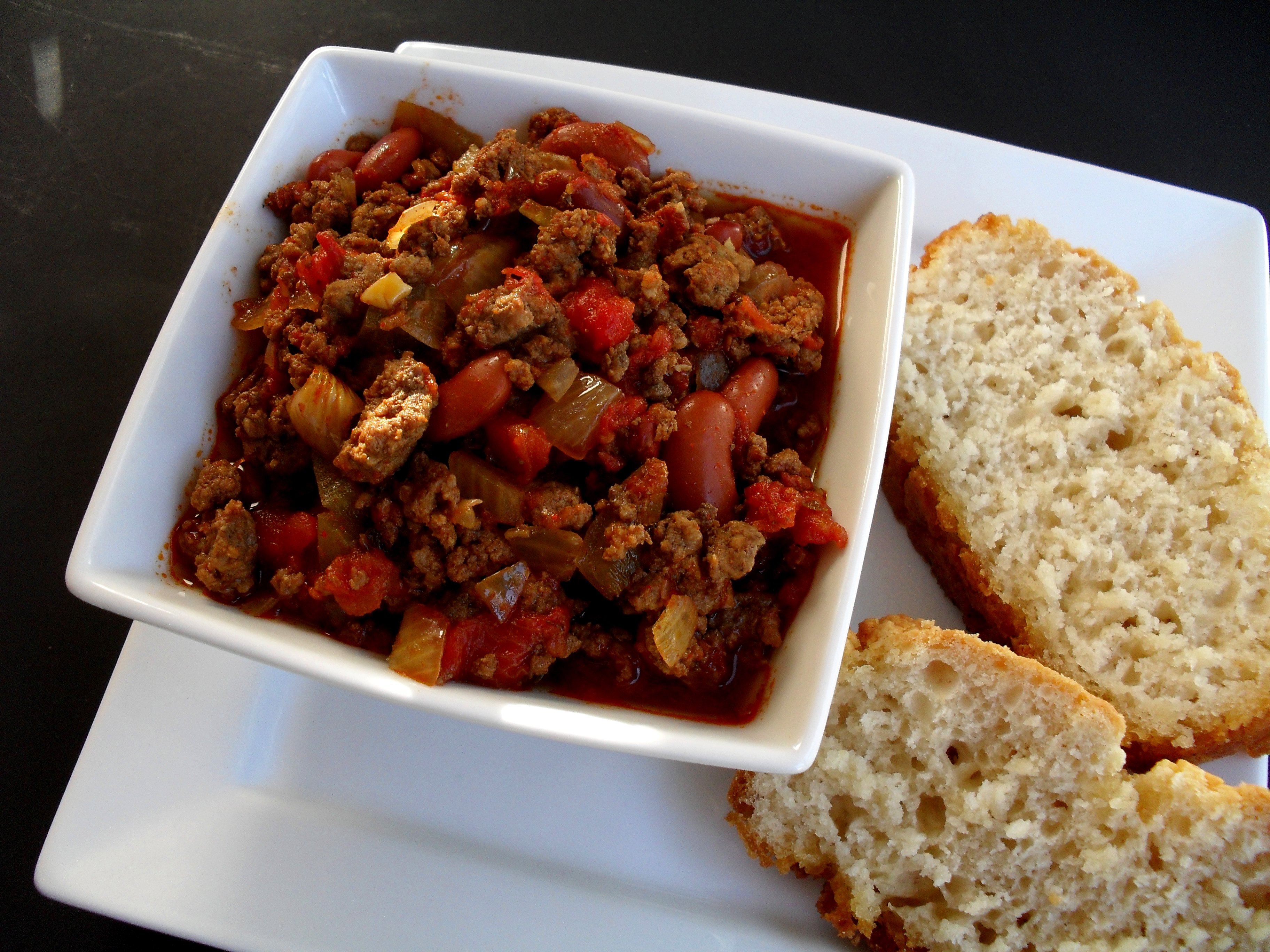 But chili is another story.  It’s what he lived on as a bachelor and may be the only thing that he really likes to cook.  I handed him the recipe for this with instructions for adapting it to what we had, preparing myself for the sound of grinding teeth (worst sound ever!), but there was no teeth grinding and he didn’t even frown a little.  He actually seemed excited.  It was like I’d been speaking a foreign language all these years and I finally communicated something he understood.  Even better, he reported that he “really enjoyed” making it.  I think his enjoyment translated into the final product because this chili is incredible!  It’s very simple, but oh so good, and if you top it with sour cream and cheese and scoop it up with tortilla chips, you get the total deluxe taco effect. :)