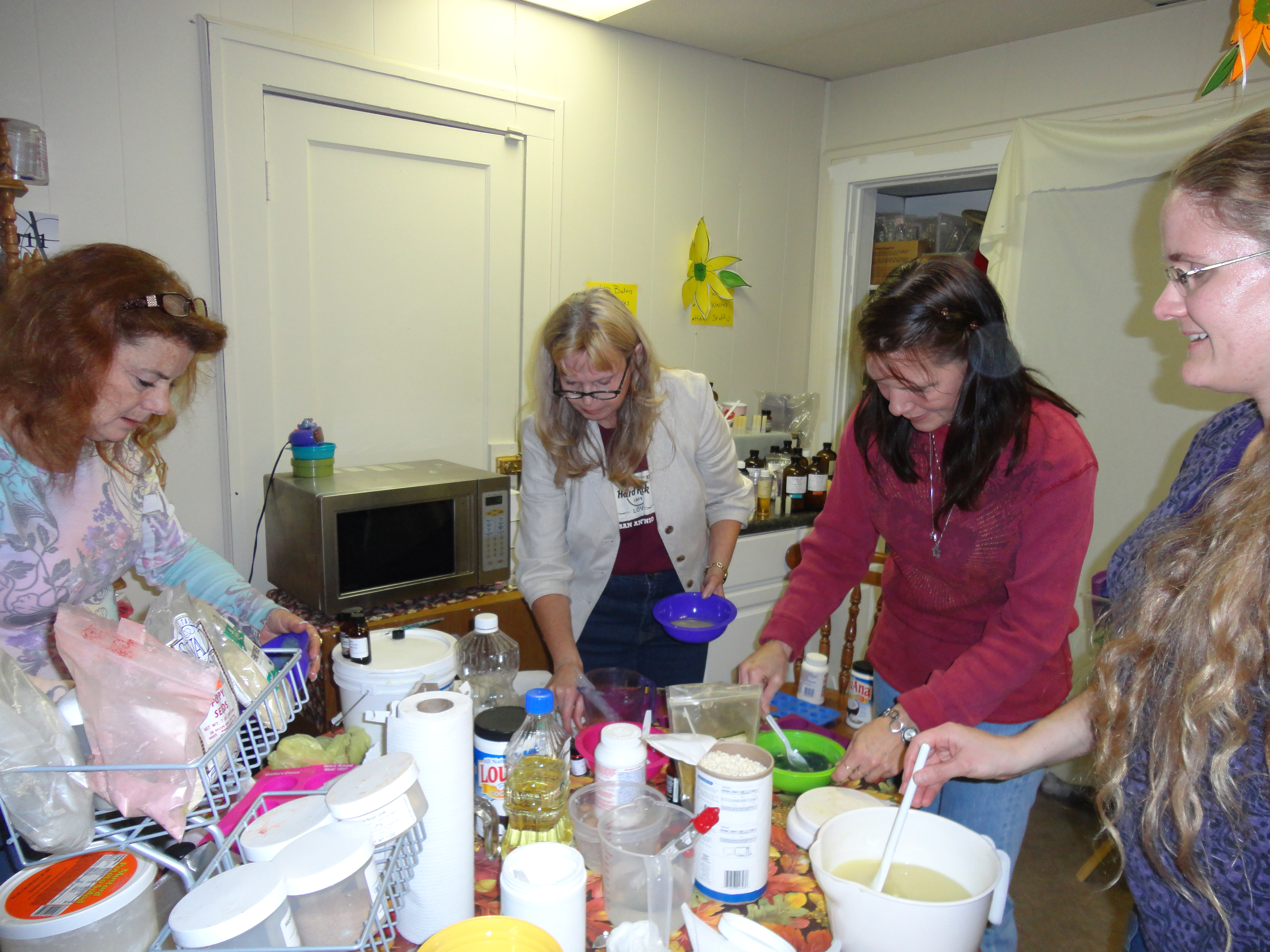 Soap wasn’t listed as a requested item, but I got the idea in my head to donate some homemade soap, and I called my sister, who is an old hand at making it by now (she has been making it for six years and selling it in her own shop for the last four), to see if she’d be game to help me do it. I knew she would love the idea, and I was right! She agreed to help me make it for only the cost of the supplies, and we met in the back room of her shop to get our soap-making party started.