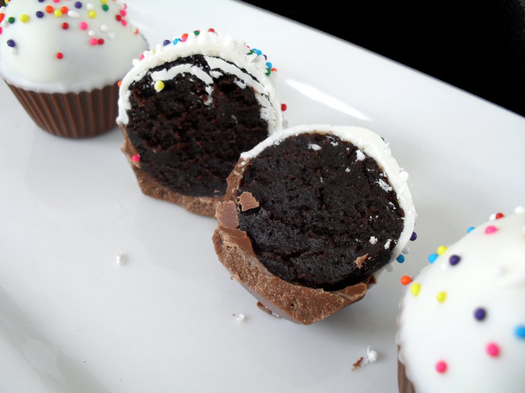 The fix: if your chocolate does crack, just spoon some melted chocolate over the crack, making sure to cover it well.  It won’t be pretty, but it will keep the cake ball contained and will still be delicious.  If you are using sprinkles, that will help disguise it.